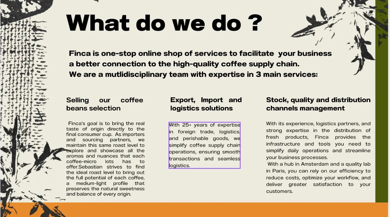 Finca.Shop is a digital and physical marketplace specializing in exporting, commercializing, and distributing the finest specialty and origin coffees from South America to Europe. Our mission is to bridge the gap between coffee producers and buyers, ensuring that high-quality coffee from its source reaches the